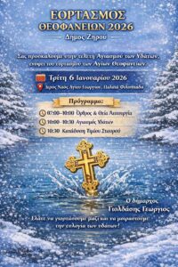 Σας προσκαλούμε στην τελετή αγιασμού των υδάτων, εν όψει του εορτασμού των Αγίων Θεοφανείων, την Τρίτη, 6 Ιανουαρίου 2026  στον Ιερό Ναό Αγίου Γεωργίου στην Παλαιά Φιλιππιάδα.